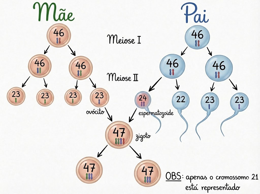 - A Falha na Separação: O par de cromossomos número 21 não se separa como deveria durante a divisão celular do pai ou da mãe.